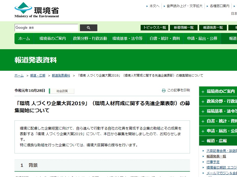 「環境人づくり企業大賞2019」(環境人材育成に関する先進企業表彰)について