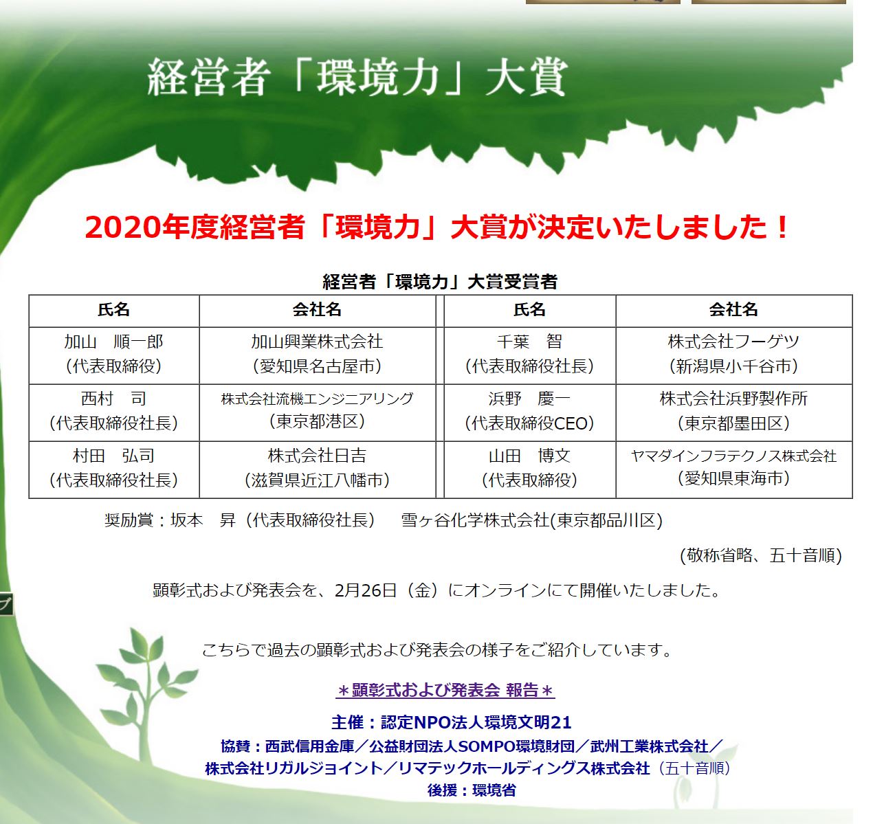第13回(2020年度)経営者「環境力」大賞 を弊社社長 村田 弘司が受賞しました。