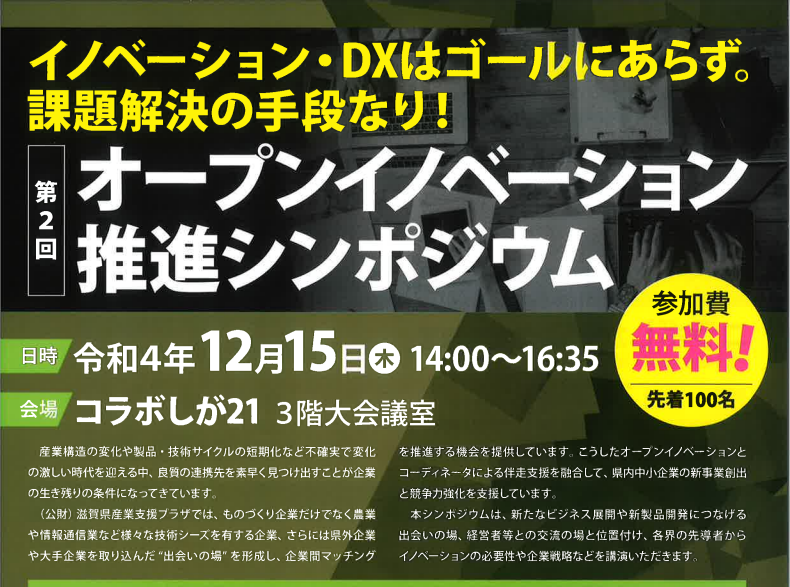 滋賀県と(公財)滋賀県産業支援プラザが主催する第2回オープンイノベーション推進シンポジウムが開催され、社長の社長が登壇します。