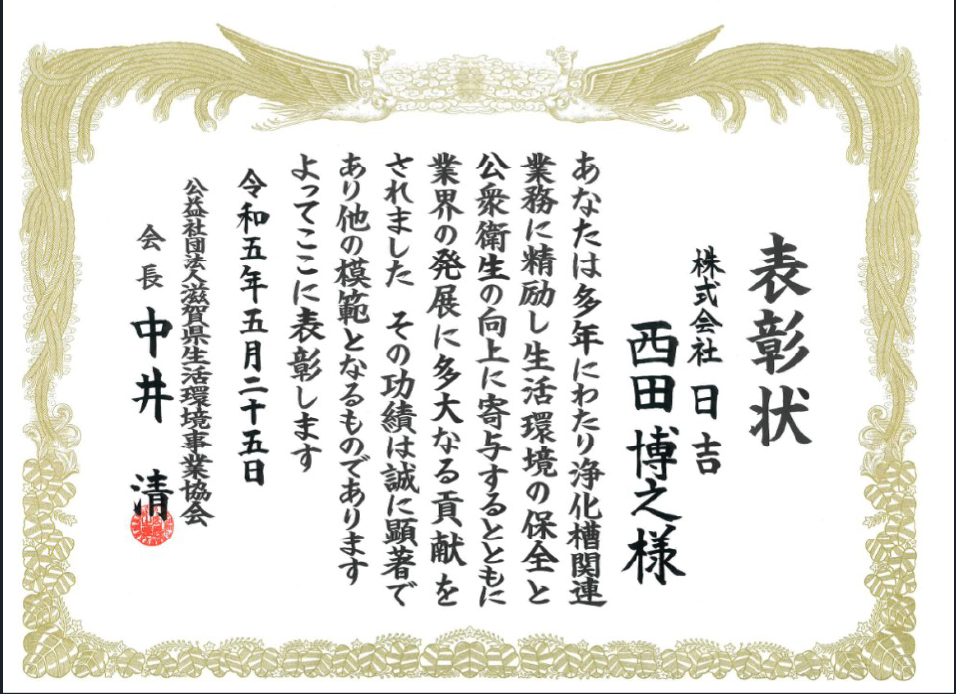 令和5年5月25日、(公財)滋賀県生活環境事業協会より施設管理部 西田次長が浄化槽関連業務に精励し生活環境の保全と公益衛生の向上に貢献したとして表彰されました。