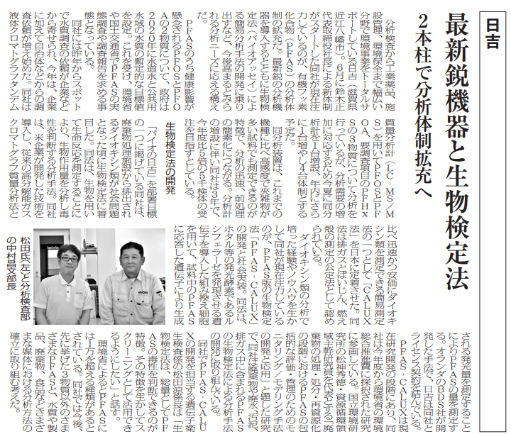 弊社は機器(液体クロマトグラフタンデム質量分析装置(LC-MS/MS))と生物検定法(バイオアッセイ)でPFAS検査を行っており、その様子が2024年11月7日発行の環境新聞に掲載されました。