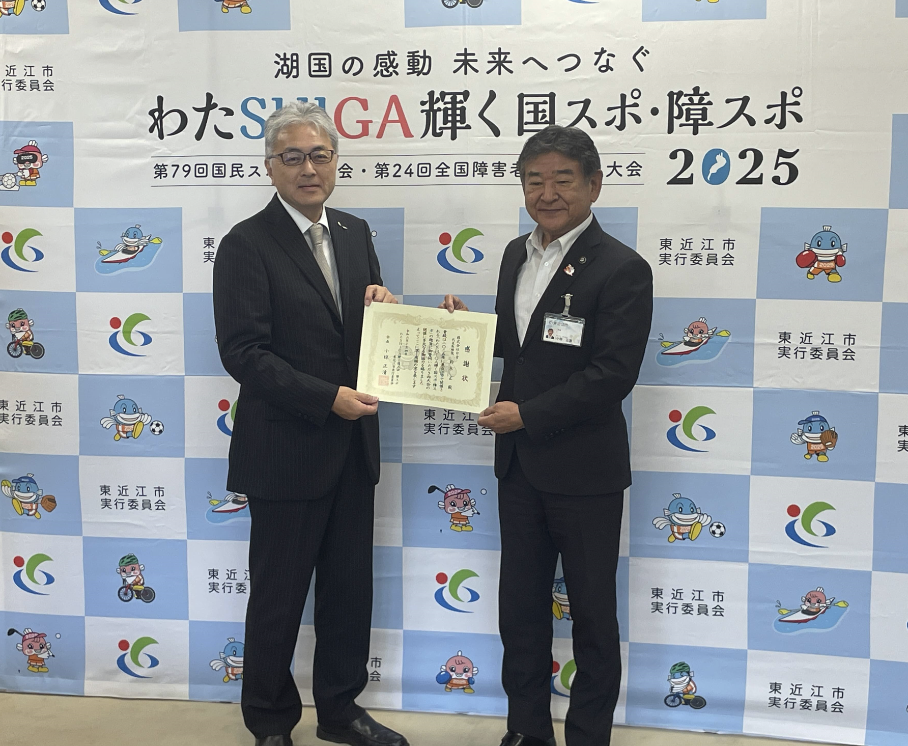 東近江市で開催される第79回国民スポーツ大会・第24回全国障害者スポーツ大会「わたSHIGA輝く国スポ・障スポ」及び競技別リハーサル大会の開催趣旨に賛同し、協賛した、として、東近江市より感謝状を受領しました。