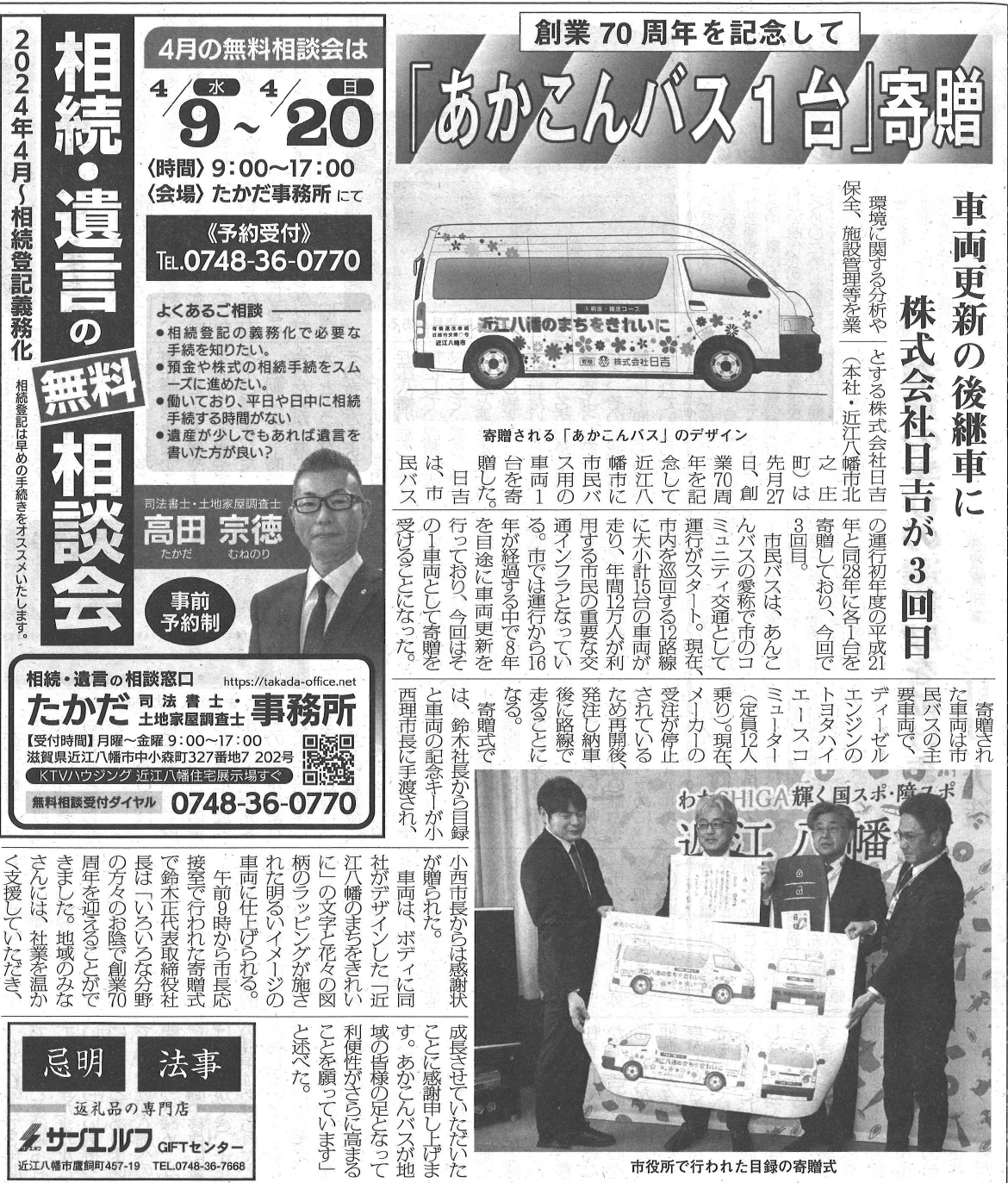 [報知新聞]近江八幡市民バス「あかこんバス」寄贈