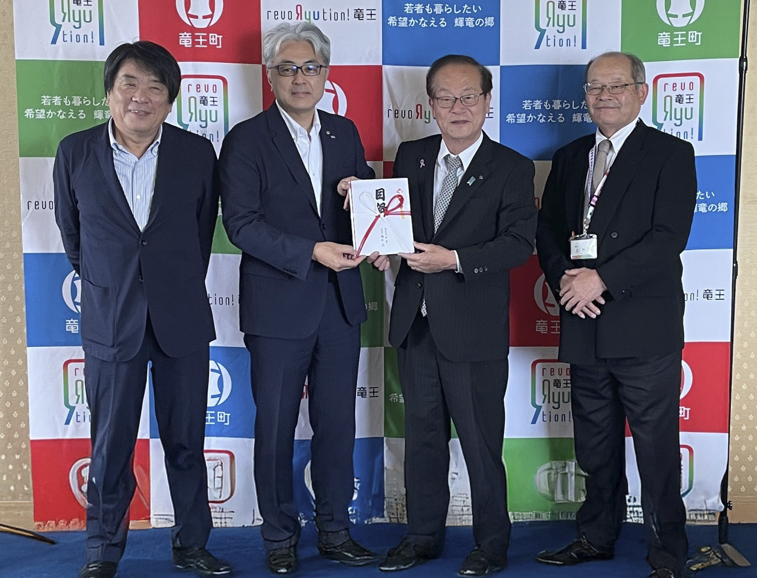 5月x日には竜王町役所にて寄贈式が行われ、西田町長から感謝の言葉を頂き、後日竜王町制施行70周年式典にて感謝状を受領しました。