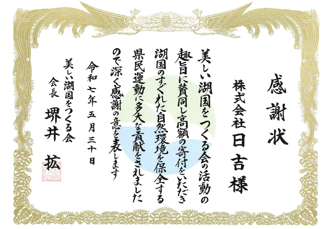 2025年5月30日に美しい湖国をつくる会より自然環境の保全への貢献を評価され感謝状を頂きました。