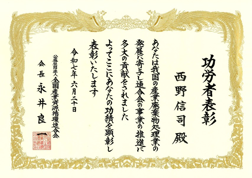 2025年6月20日に公益社団法人全国産業資源循環連合会より、産業廃棄物処理業の発展に寄与し連合会の事業に貢献したとして、取締役 西野 信司が表彰されました。