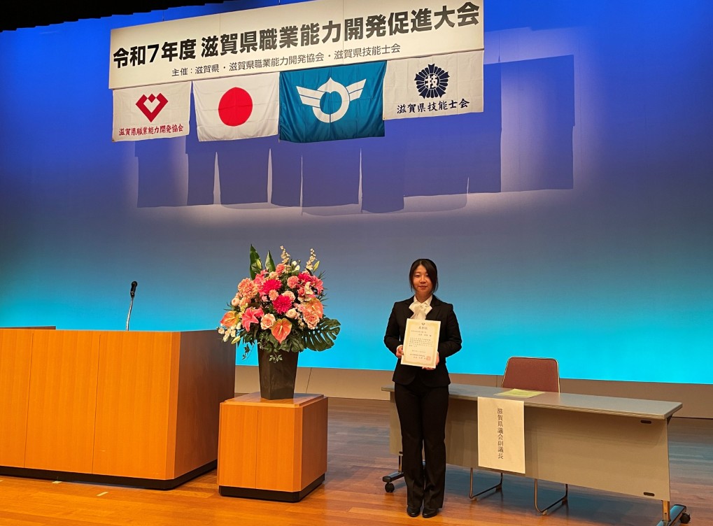 令和7年度技能競技大会において特に優秀な成績を修めたとして、当社分析検査部社員が滋賀県職業能力開発協会の会長表彰を受領しました。