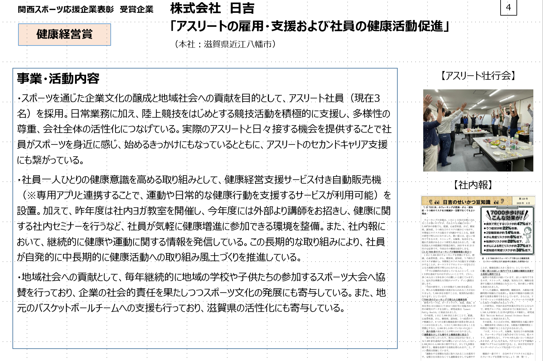 当社は、第7回「関西スポーツ応援企業表彰」において、アスリートの雇用・支援および社員の健康活動促進の取り組みが評価され、健康経営賞を受賞いたしました。