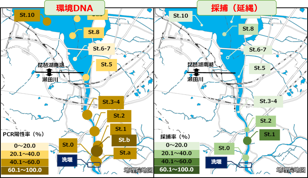 その結果、瀬田川河口と洗堰周辺に多く生息していること、また環境DNAの方がより高感度に駆除効果を評価できることが明らかになりました。