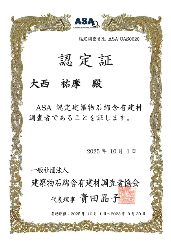 滋賀県内で初めて、当社の社員がASA認定建築物石綿含有建材調査者の資格を取得しました。建築物に使用されている石綿事前調査を実施するには、専門的な知識と実務能力が求められます。この資格はASA(一般社団法人 建築物石綿含有建材調査者協会)の研修プログラムを修了し、専門機関によって一定の技術水準を満たしていると認定されたものに付与されます。有資格者による体制の強化により、当社はさらに専門性の高い知識と技術をもって高精度なアスベスト分析サービスをご提供します。