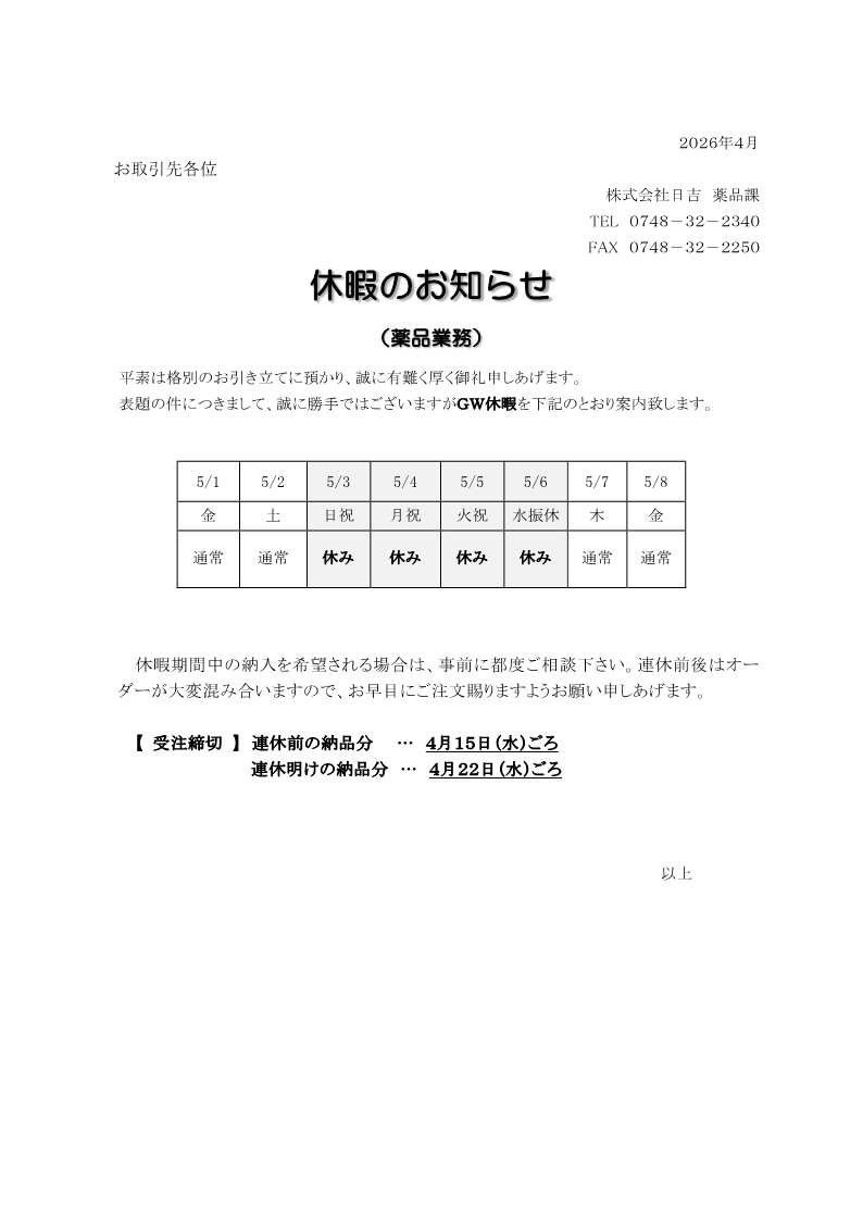 [薬品部門]ゴールデンウィーク休業のお知らせ