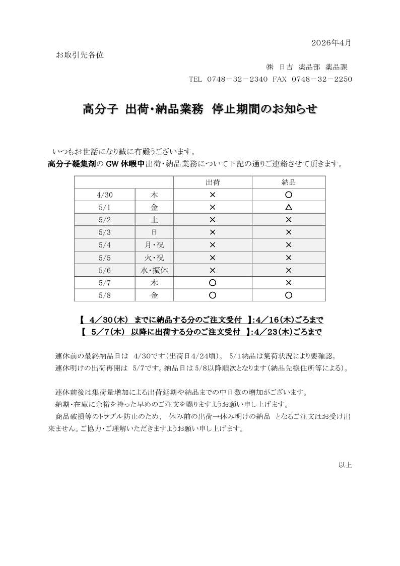 表題の件につきまして、誠に勝手ではございますがGW休暇を添付のとおりご案内致します。